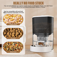 No jamming: the cat dog feeder is designed with dual rotor structure and inclined food outlet, an advanced impeller prevents food jams and for smooth and precise feeding. Whether dry food, air-dried food or freeze-dried food (particles <15 mm).