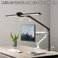 Flexible folding swivel arm and 360° rotating base: the double head desk lamp has 3 strong damping folding swivel arms and a 360° rotating base. The office lamp supports a maximum working height of 67 cm, has a longer range adapts to different positions. The base clamp supports table thicknesses up to 5 cm and thus saves space.